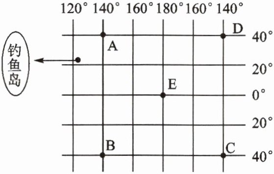 $A$点:经度是$140^{\circ}E$,纬度是$40^{\circ}N$,即$A(140^{\circ}E,40^{\circ}N)$。
