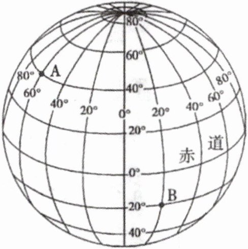 $A(60^{\circ}W,40^{\circ}N)$与$(50^{\circ}W,20^{\circ}S)$ 经度差$\vert60 - 50\vert= 10^{\circ}$,纬度差$\vert40+20\vert = 60^{\circ}$。