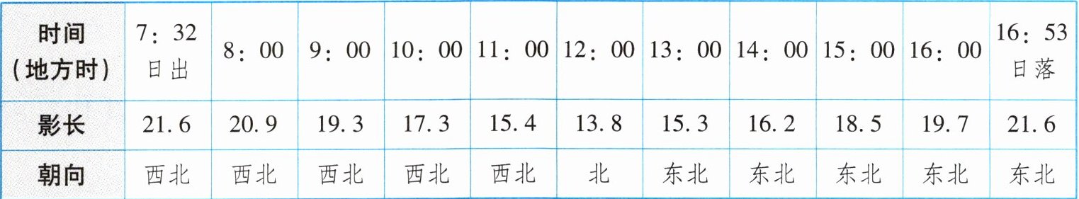 (1)读表,指出一天中物体影长最短的时间并总结物体影长随时间变化规律。