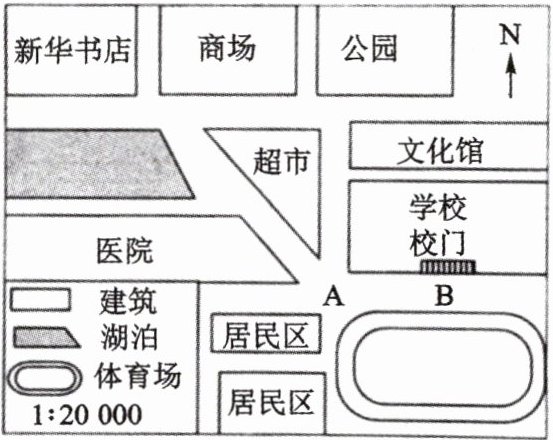 (3)先从校门B向西走到A路口,再向西北走到新华书店。