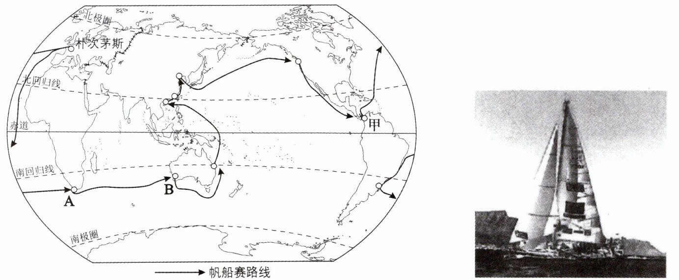 (1)说出此次帆船赛出发地所属的大洲及船队环球一周依次经过的大洋。