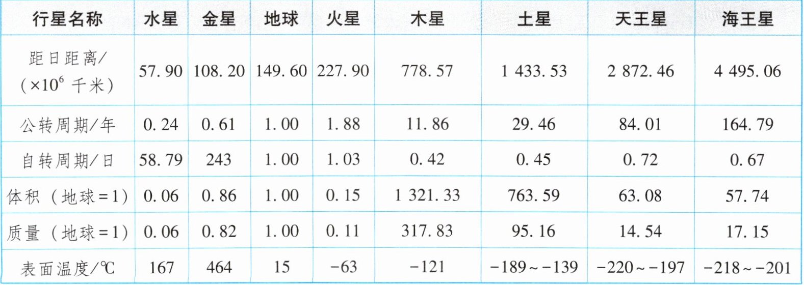 资料一 太阳系八颗行星数据。
