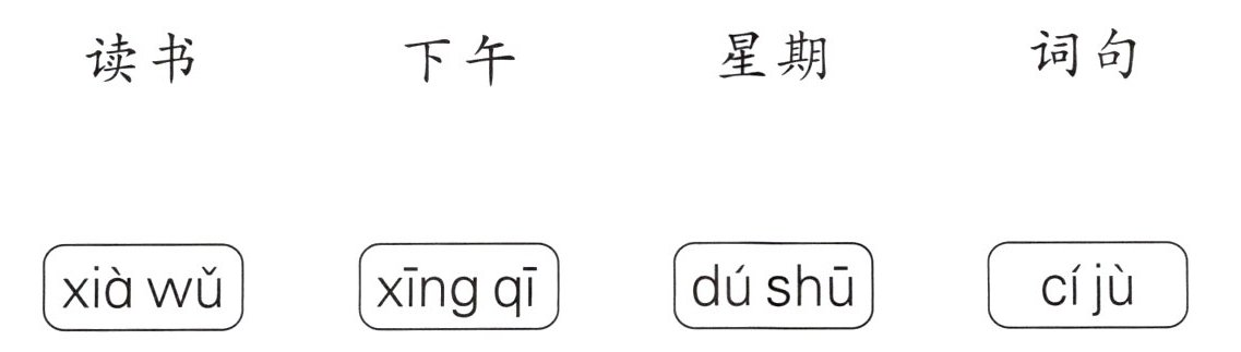 读书——dú shū;下午——xià wǔ;星期——xīng qī;词句——cí jù