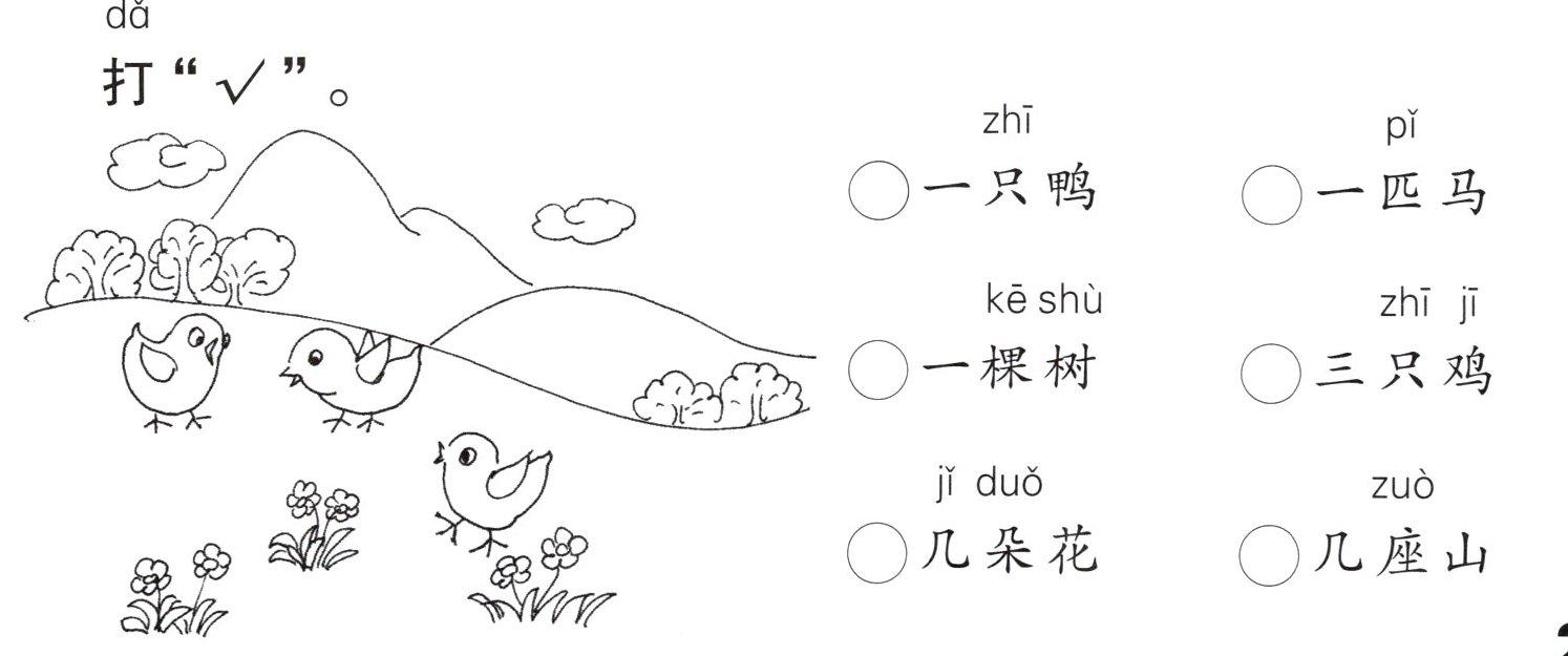 七、读一读,选出图中的景物,请在“○”里打“√”。