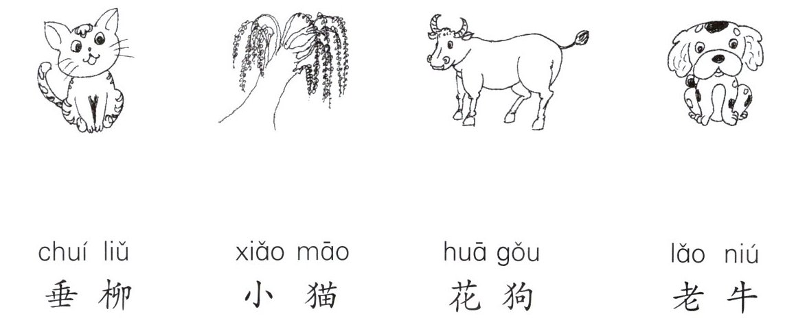 (第一幅图连“小猫”,第二幅图连“垂柳”,第三幅图连“老牛”,第四幅图连“花狗”)