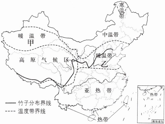 4. 图中甲区域与乙区域属于同一温度带,甲区域没有竹子分布。主要原因是甲区域(