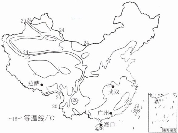 下图示意我国7月等温线分布。读图,完成1、2题。