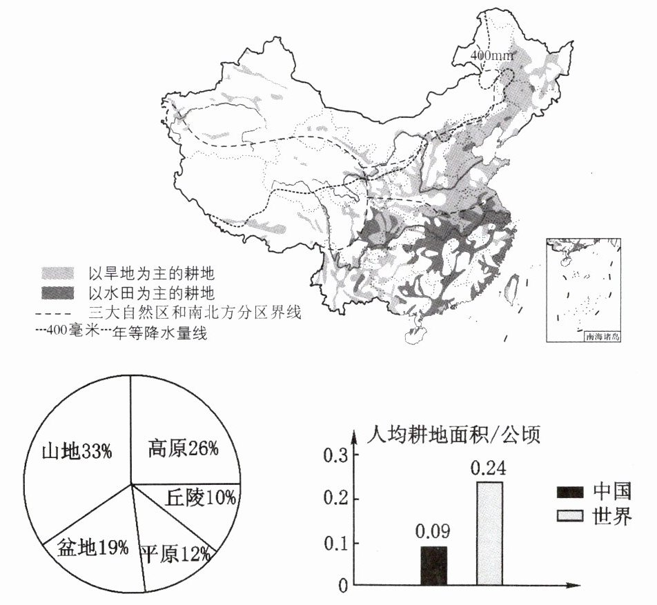耕地为粮食生产提供空间,保护耕地尤为重要。下图分别示意中国耕地分布、中国地形类型构成、中国与世界人均耕地对比。