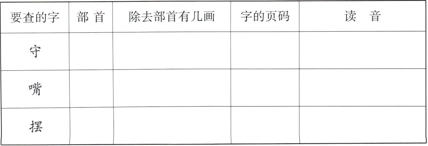 | 要查的字 | 部首 | 除去部首有几画 | 字的页码 | 读音 |