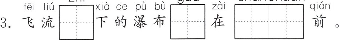 3. 飞流$\begin{array}{|c|c|c|c|}\hline zhí & & & \\\hline\end{array}\\\hline 下的瀑布\begin{array}{|c|c|c|c|}\hline guà & & & \\\hline\end{array}\\\hline 在\begin{array}{|c|c|c|c|}\hline shān & chuān & & \\\hline\end{array}\\\hline $前。