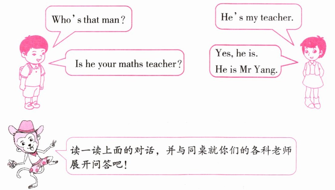 (示例)A: Who's that woman? B: She's my English teacher. A: Is she your Chinese teacher? B: No, she isn't. She's Miss Li. (此为口语交际示例,实际操作中与同桌互动即可)