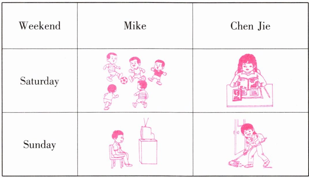 五、根据表格信息,帮 Mike 和 Chen Jie 用完整的形式把周末活动记录下来,并描述你的周末活动。