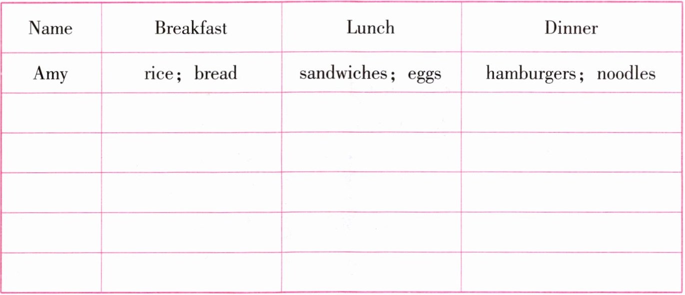 四、请你用所给句型调查你们组的同学一日三餐都吃什么,并记录在表格里。