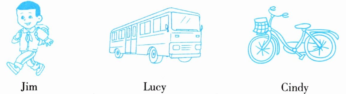 四、根据图示,写出 Jim、Lucy 与 Cindy 的上学方式,不少于五句话。