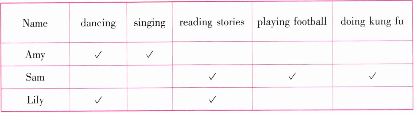 | Name | dancing | singing | reading stories | playing football | doing kung fu |