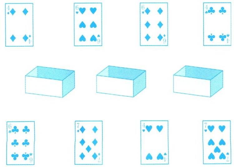 3. 把下面的扑克牌放进三个盒子里,可以怎样放?想一想,连一连。