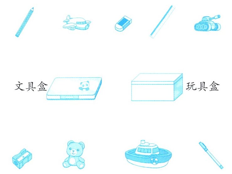 1. 把哪些放在文具盒里?把哪些放在玩具盒里?连一连。