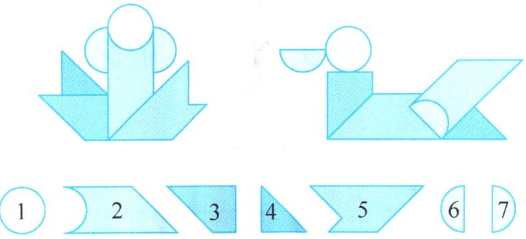 鸭:圆形是7,半圆是6,大三角形是3,大平行四边形(鸭的身体部分大块)是5,小三角形是4,长方形是1,小平行四边形是2。