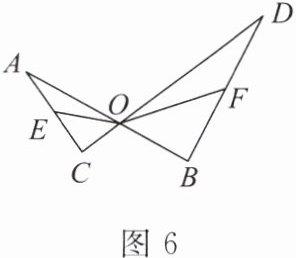 如图 6, $ AB $, $ CD $ 相交于点 $ O $,连接 $ AC $, $ BD $, $ E $, $ F $ 分别为 $ AC $, $ BD $ 的中点,连接 $ OE $, $ OF $。已知 $ \angle A = \angle D $, $ OA = OF = 6 $, $ OD = 9 $,求 $ OE $ 的长。