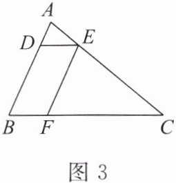 1. 如图 3,在 $ \triangle ABC $ 中,点 $ D $, $ E $, $ F $ 分别在边 $ AB $, $ AC $, $ BC $ 上,连接 $ DE $, $ EF $。已知四边形 $ BFED $ 是平行四边形, $ \frac{DE}{BC} = \frac{1}{4} $。