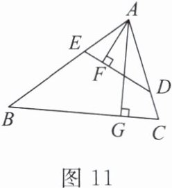 如图 11,在锐角三角形 $ ABC $ 中,点 $ D $, $ E $ 分别在边 $ AC $, $ AB $ 上,过点 $ A $ 作 $ AG \perp BC $ 于点 $ G $, $ AF \perp DE $ 于点 $ F $, $ \angle EAF = \angle CAG $。