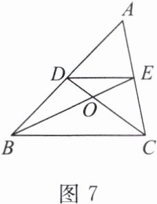 2. 如图 7,在 $ \triangle ABC $ 中,点 $ D $, $ E $ 分别在边 $ AB $, $ AC $ 上, $ DC $ 与 $ BE $ 相交于点 $ O $,且 $ OD = 2 $, $ OB = DC = 6 $, $ OE = 3 $。