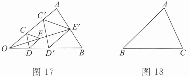 【阅读材料】 如图17,我们把顶点分别在$\triangle OAB$的三条边上的等边三角形$C'D'E'$,称为$\triangle OAB$的“内接等边三角形”。下面是运用位似知识作$\triangle OAB$的“内接等边三角形”的具体步骤。