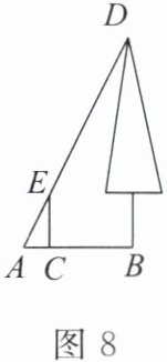 1.如图8,小红在平地上利用标杆测量一棵大树的高度,移动竖立着的标杆,使标杆影子的顶端和大树影子的顶端恰好在地面的同一点A处.已知标杆EC的高为2m,此时测得BC = 3m,CA = 1m,则树DB的高度是(