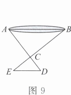 2.如图9,为估算某鱼塘的宽AB的长度,在地面上取点C,D,E,使A,C,D在同一条直线上,B,C,E在同一条直线上,且CD = $\frac{1}{3}$AD,CE = $\frac{1}{3}$BE.若测得ED的长为15m,则AB的长为(