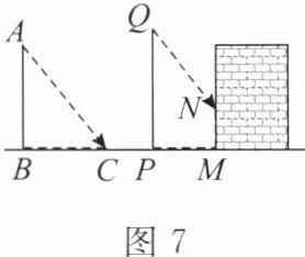 2.在同一时刻两根木杆在太阳光下的影子如图7,其中木杆AB = 2m,它的影子BC = 1.6m,木杆PQ的影子有一部分落在墙上,PM = 1.2m,MN = 0.8m.求木杆PQ的长度.(同一时刻的太阳光线可看作是平行的)