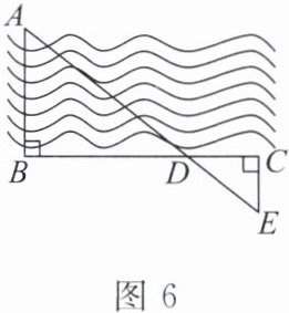 1.如图6,为了估计河的宽度,我们可以在河对岸的岸边选定一个目标记为点A,再在河的这一边选B,C,E三点,使得AB⊥BC,EC⊥BC.设BC与AE交于点D.现测得BD = 120m,DC = 40m,EC = 30m,那么这条河的大致宽度是(