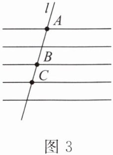 6. 如图3,五线谱是由等距离的五条平行横线组成的,$A$,$B$,$C$是直线$l$与这组平行线的三个交点。若$AB = 4$,则$BC$的长是(