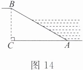 5. 如图14,某水库堤坝横断面迎水坡$AB$的坡度是$1:\sqrt{3}$,堤坝高$BC = 50m$。求迎水坡面$AB$的长。