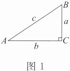 2. 直角三角形中的边角关系:如图 1,Rt△ABC 共有六个元素(三条边,三个角),其中∠C = 90°,那么其余五个元素(三边 a,b,c,两锐角 A,B)之间有如下关系。