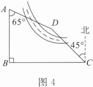例 某区域平面示意图如图4,点D在河的右侧,AB路段与某桥BC互相垂直。某校“数学兴趣小组”在“研学旅行”活动中,在C处测得点D位于西北方向,又在A处测得点D位于南偏东$65^{\circ}$方向,另测得$BC=414m$,$AB=300m$。求点D到AB的距离。(参考数据:$\sin 65^{\circ}\approx 0.91$,$\cos 65^{\circ}\approx 0.42$,$\tan 65^{\circ}\approx 2.14$)