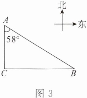 3. 如图3,海面上有A,B两岛分别位于C岛的正北方向和正东方向上,一艘船从C岛出发,以$20n mile/h$的速度向正北方向航行$2h$到达A岛,此时测得B岛在A岛的南偏东$58^{\circ}$方向上。则$AC=$