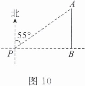 1. 如图10,一艘海轮位于灯塔P的北偏东$55^{\circ}$方向的A处,$PA=6n mile$。若海轮沿正南方向航行到灯塔P的正东方向,则海轮航行的距离AB的长是(