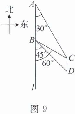 4. (2024黑龙江大庆中考)如图9,CD是一座南北走向的大桥,一辆汽车在笔直的公路l上由北向南行驶,在A处测得桥头C在南偏东$30^{\circ}$方向上,继续行驶$1500m$后到达B处,测得桥头C在南偏东$60^{\circ}$方向上,桥头D在南偏东$45^{\circ}$方向上。求大桥CD的长度。(结果精确到$1m$,参考数据:$\sqrt{3}\approx 1.73$)
