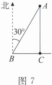 2. (2023广东广州中考)如图7,海中有一座小岛A,在点B测得小岛A在北偏东$30^{\circ}$方向上,渔船从点B出发,由西向东航行$10n mile$到达点C,在点C测得小岛A恰好在正北方向上,此时渔船与小岛A的距离为(