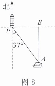 3. 如图8,一艘海轮位于灯塔P的南偏东$37^{\circ}$方向,距离灯塔$40n mile$的A处,它沿正北方向航行一段时间后,到达位于灯塔的正东方向上的B处。这时,B处与灯塔P的距离PB的长为