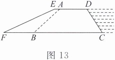 7. 现要对一段长$200\mathrm{m}$且横断面为梯形的大坝用土石进行加固。如图13,加固前大坝背水坡坡面从$A$至$B$共有$30$级阶梯,平均每级阶梯高$30\mathrm{cm}$,斜坡$AB$的坡度$i=1:1$;加固后,坝顶宽度增加$2\mathrm{m}$,斜坡$EF$的坡度$i=1:\sqrt{5}$。问这个工程共需土石多少立方米?(计算土石时忽略阶梯,结果精确到$1\mathrm{m}^3$,参考数据:$\sqrt{5}\approx2.24$)
