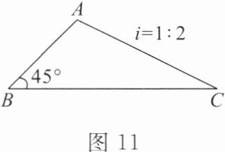 5. 小亮和小强同时登山,小亮从北坡山脚$C$处出发,以$38\mathrm{m}/\mathrm{min}$的平均速度攀登,小强从南坡山脚$B$处出发。如图11,已知山北坡的坡度$i=1:2$,北坡长为$380\mathrm{m}$,南坡的坡角是$45^{\circ}$。问小强以什么速度攀登才能和小亮同时到达山顶$A$?(将南坡、北坡的山路分别看作线段$AB$,$AC$。结果精确到$1\mathrm{m}/\mathrm{min}$,参考数据:$\sqrt{2}\approx1.41$,$\sqrt{5}\approx2.24$)