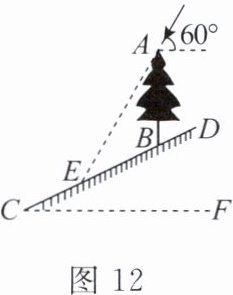 6. (2024四川眉山中考)如图12,斜坡$CD$的坡度$i=1:2$,在斜坡上有一棵垂直于水平面的大树$AB$,当太阳光与水平面的夹角为$60^{\circ}$时,大树在斜坡上的影子$BE$长为$10\mathrm{m}$,则大树$AB$的高为