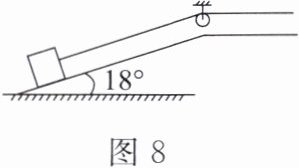 2. (跨学科)如图8,通过定滑轮的牵引,一个滑块沿坡角为$18^{\circ}$的斜坡向上移动了$15\mathrm{m}$,此时滑块上升的竖直高度是(