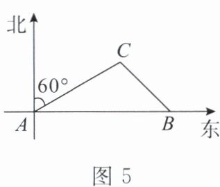 10. 如图5,某巡逻艇从$A$处沿着北偏东$60^{\circ}$方向巡逻,到达$C$处时接到命令,立刻在$C$处沿东南方向以$20\ n mile/h$的平均速度航行$3\ h$到达港口$B$,港口$B$在$A$处的正东方向。$A$,$B$间的距离为(