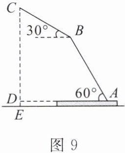16. (14分)如图9,放置在水平桌面上的台灯的灯臂$AB$长为$30\ cm$,灯罩$BC$长为$20\ cm$,底座厚度$DE$为$2\ cm$,灯臂与底座构成的$\angle BAD = 60^{\circ}$。使用发现,光线最佳时灯罩$BC$与水平线所成的角为$30^{\circ}$,求此时灯罩顶端$C$到桌面的高度$CE$。(结果精确到$0.1\ cm$,参考数据:$\sqrt{3} \approx 1.732$)