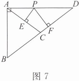 14. 如图7,在$ Rt\triangle ABD$中,$\angle BAD = 90^{\circ}$,$AB = 6$,$\tan D = \frac{3}{4}$,$C$为斜边$BD$的中点,$P$为$AD$上任一点,过点$P$作$PE \perp AC$于点$E$,$PF \perp BD$于点$F$,则$PE + PF =$