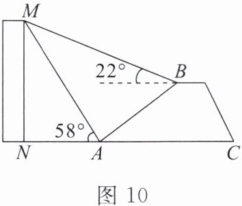 17. (16分)在一次数学课外实践活动中,某小组要测量一幢大楼$MN$的高度。如图10,在山坡的坡脚$A$处测得大楼顶部$M$的仰角是$58^{\circ}$,沿着山坡向上走$75\ m$到达$B$处,在$B$处测得大楼顶部$M$的仰角是$22^{\circ}$,已知斜坡$AB$的坡度$i = 1:\frac{4}{3}$,求大楼$MN$的高度。(图中的点$A$,$B$,$M$,$N$,$C$均在同一平面内,$N$,$A$,$C$在同一水平线上,参考数据:$\tan 22^{\circ} \approx 0.4$,$\tan 58^{\circ} \approx 1.6$)