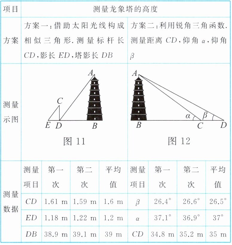 (3)(答案不唯一,合理即可)两种方案均可测量出龙象塔的高度;取平均值是减少误差的方式.