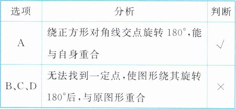 选项B、C、D:均无法找到一点,使其绕该点旋转180°后与自身重合,不是中心对称图形。